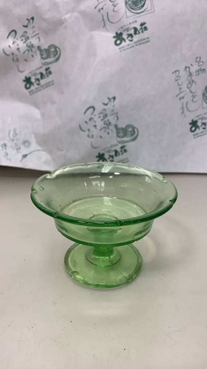 - S0501→ 昭和レトロ 緑色ガラスの氷コップ 古道具 アンティーク キャンディポット 和硝子 駄菓子瓶 吹きガラス ガラス工芸