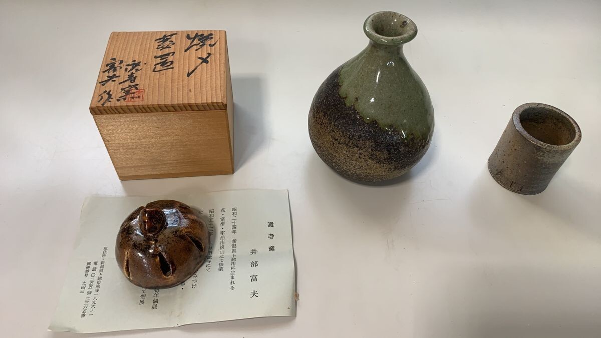 > G0304→滝寺窯 井部富夫 松灰釉 酒器 徳利 花入 花瓶 蓋置 ふた置 茶道具 陶芸家