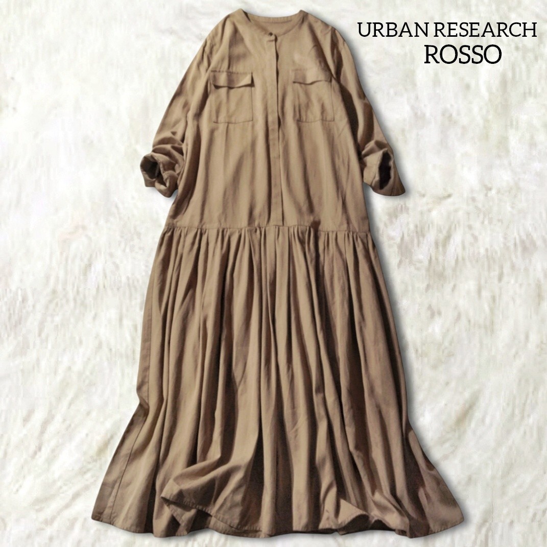 > 73 【F by ROSSO】 アーバンリサーチ ロッソ ゆったり シャツワンピース ロングワンピース 無地 ベージュ 長袖 バンドカラー ギャザー 秋冬