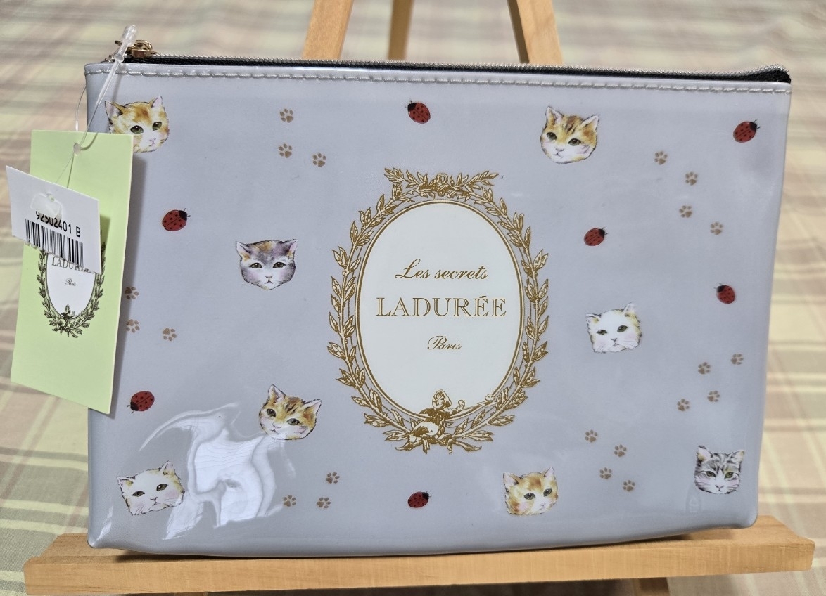 - ♪スクレ・ラデュレ♪LADUREE♪キャット柄♪ロゴ入り♪フラットポーチ♪グレー
