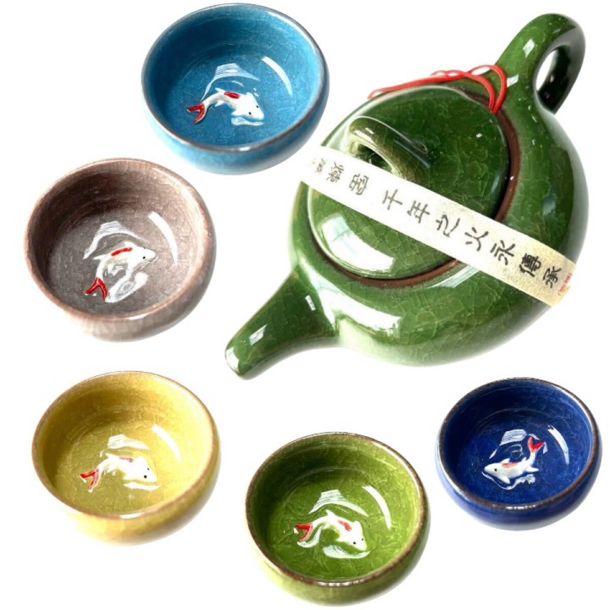 - G169 新品 鉄瓶 南部鉄器 ティーポット 中国陶器カンフーティーセット、氷割れ模様ダークグリーンセラミックティーハウスセット