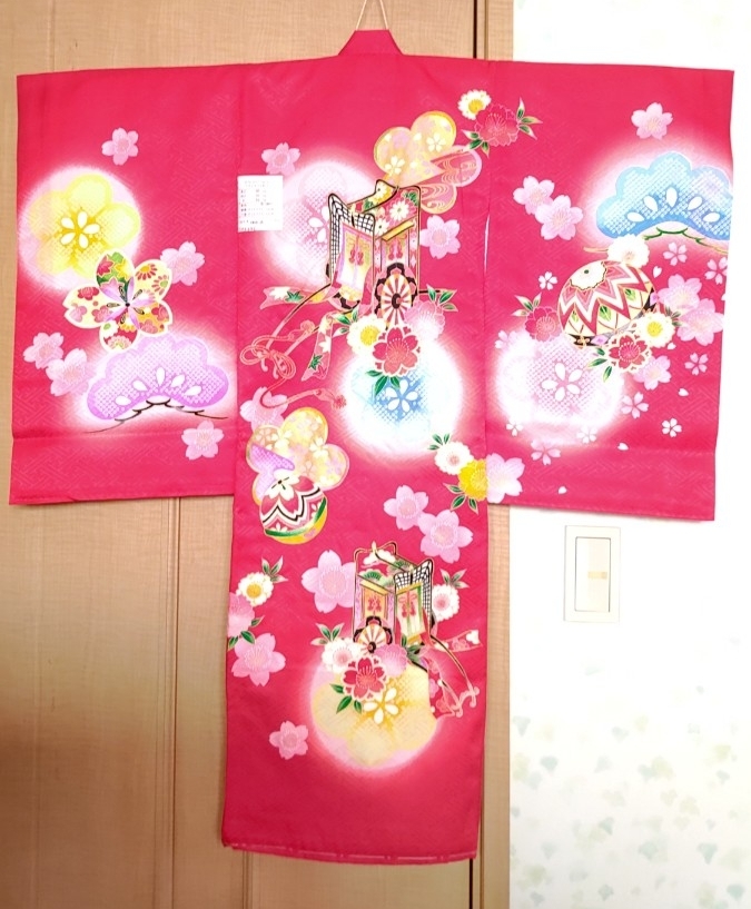 - 女の子一つ身着物(赤地に松や桜、毬や御所車)・特価