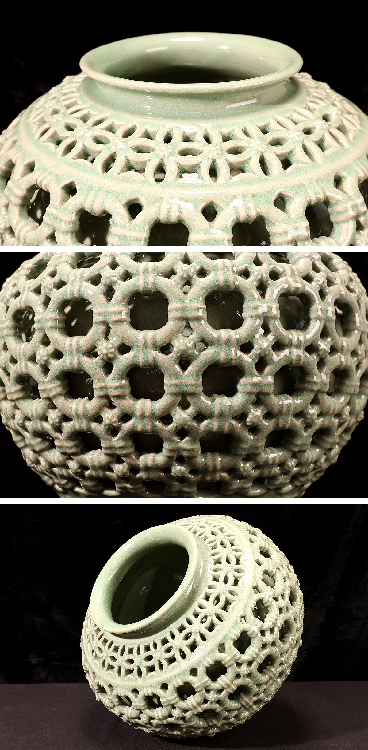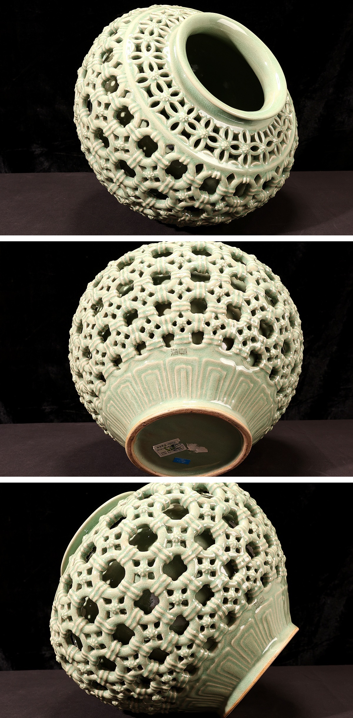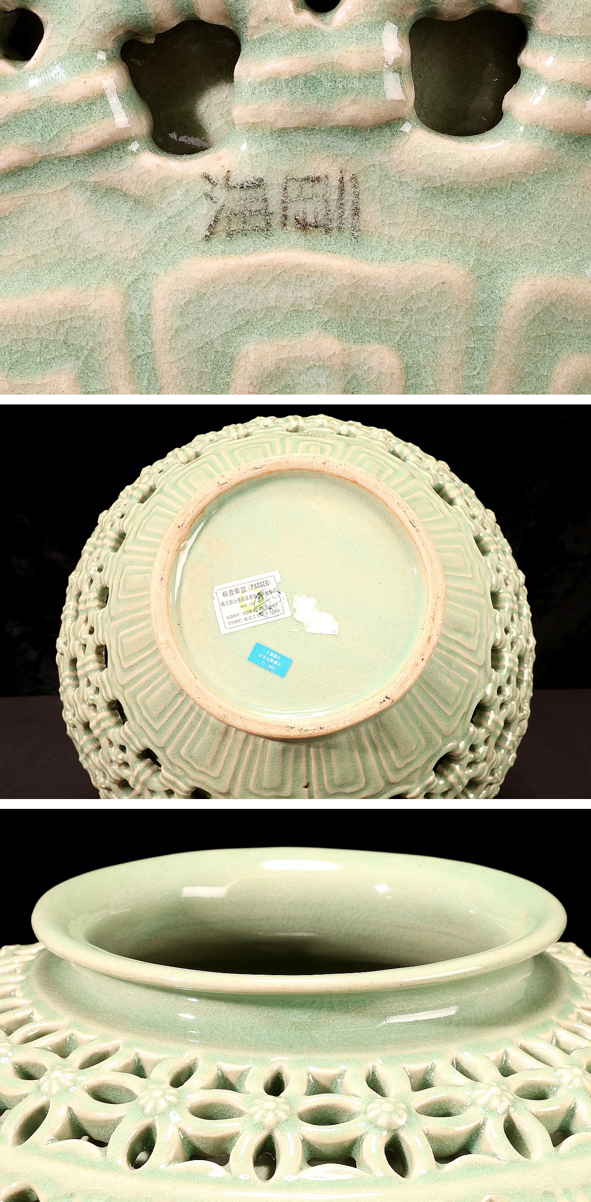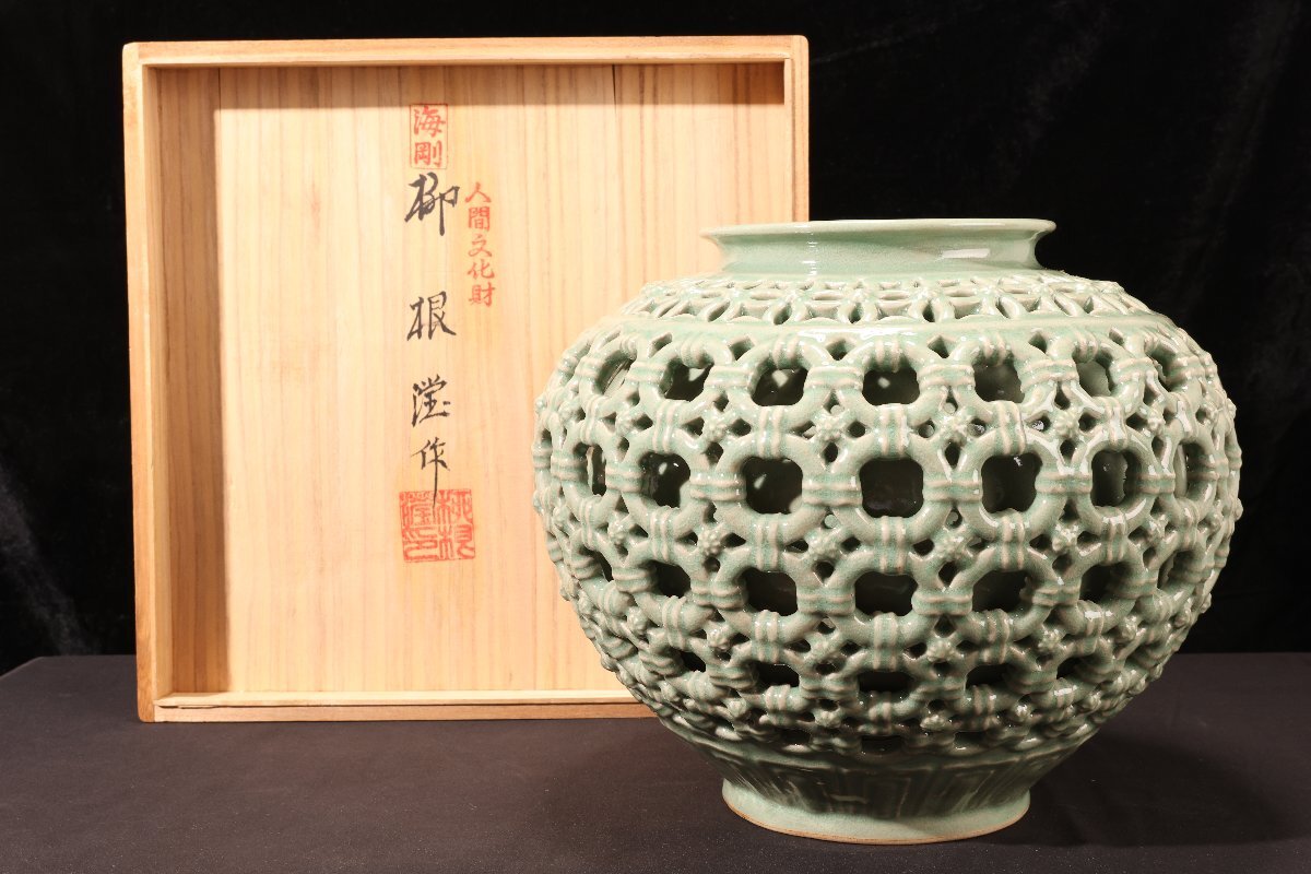 - 【珍品堂】1円から X84-V90 朝鮮人間国宝 柳海剛 柳根瀅 高麗青磁 青磁花瓶 花入 飾壺 共箱 古美術 骨董品 口径16.5㎝ 幅32㎝ 高28㎝