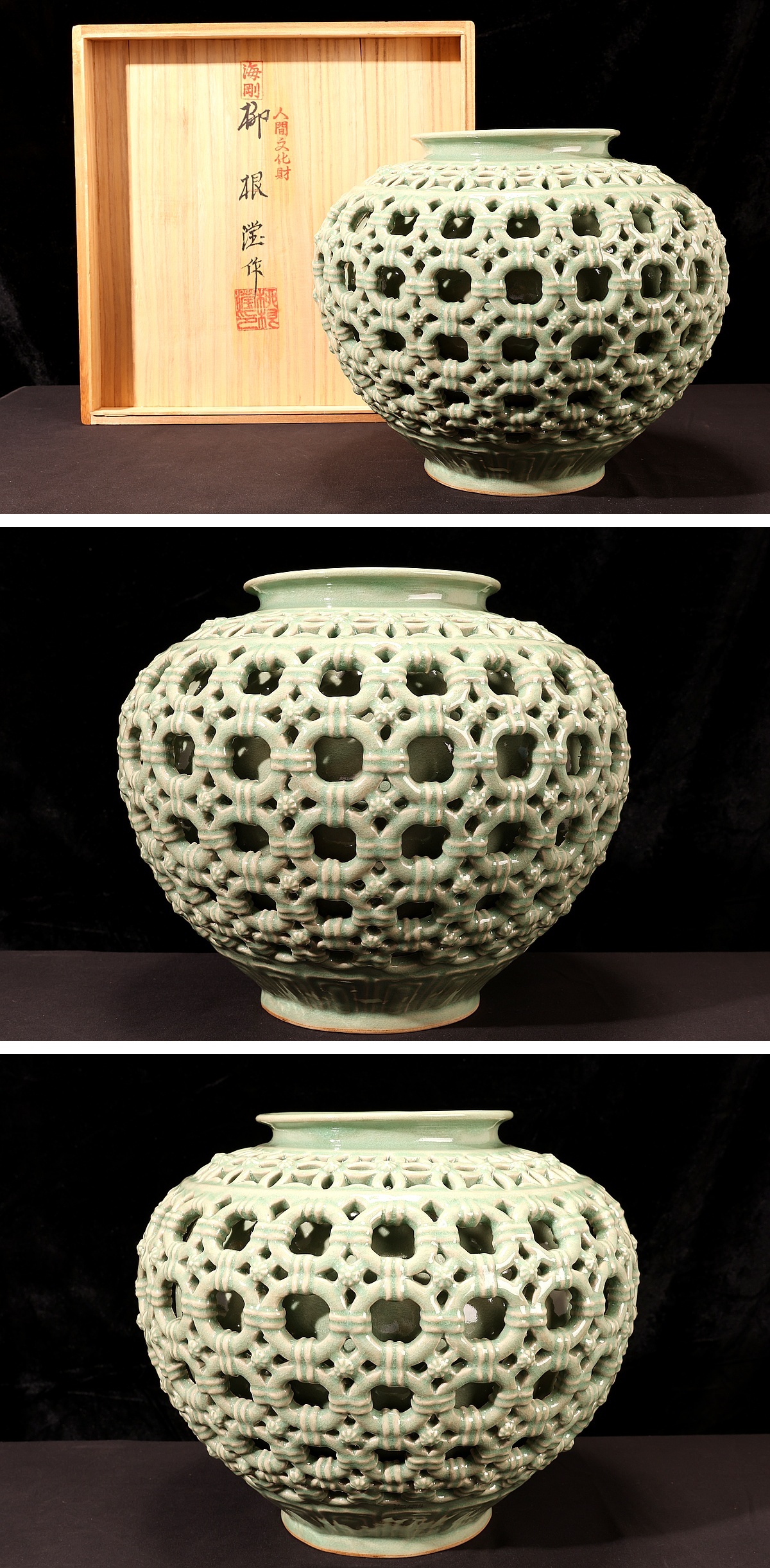 > 【珍品堂】1円から X84-V90 朝鮮人間国宝 柳海剛 柳根瀅 高麗青磁 青磁花瓶 花入 飾壺 共箱 古美術 骨董品 口径16.5㎝ 幅32㎝ 高28㎝