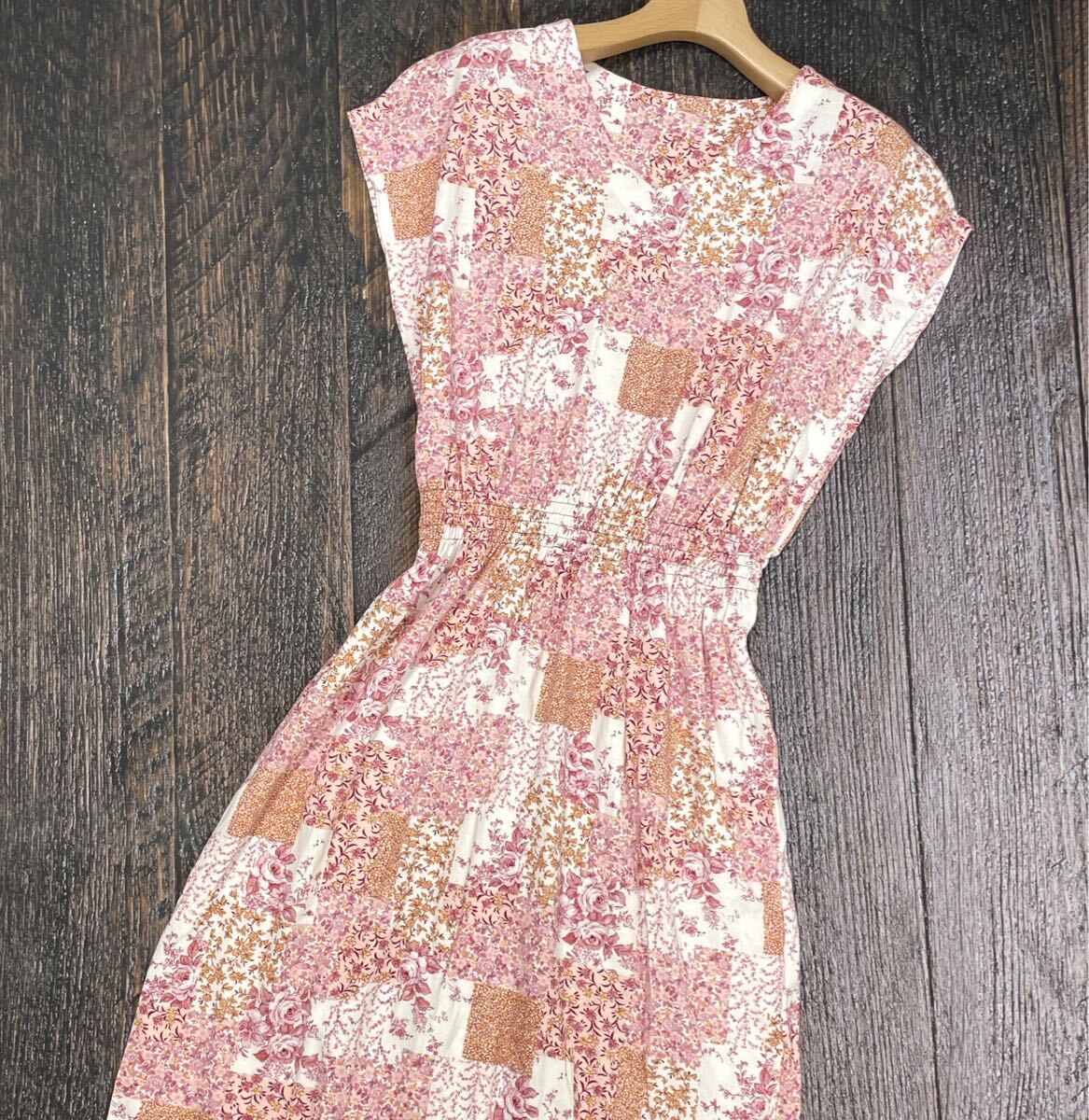 > 花柄 ワンピース 袖なし レディース Lサイズ L ピンク 総柄 柄物 パッチワーク風 ロング丈 ミモレ丈 ノースリーブ