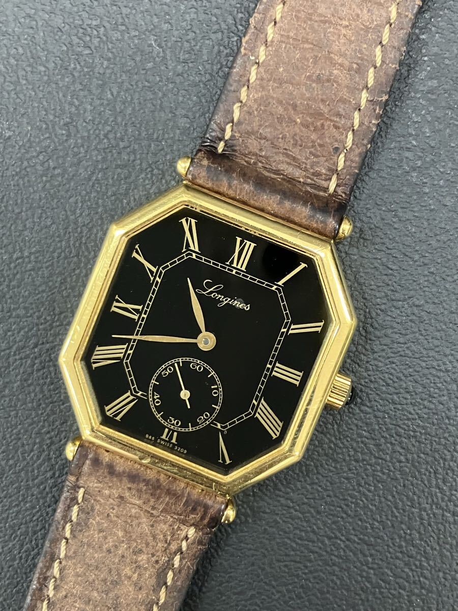 - j9e28 LONGINES ロンジン オクタゴン 腕時計 手巻き ブラック文字盤 革ベルト 稼働品 ケース 箱付き