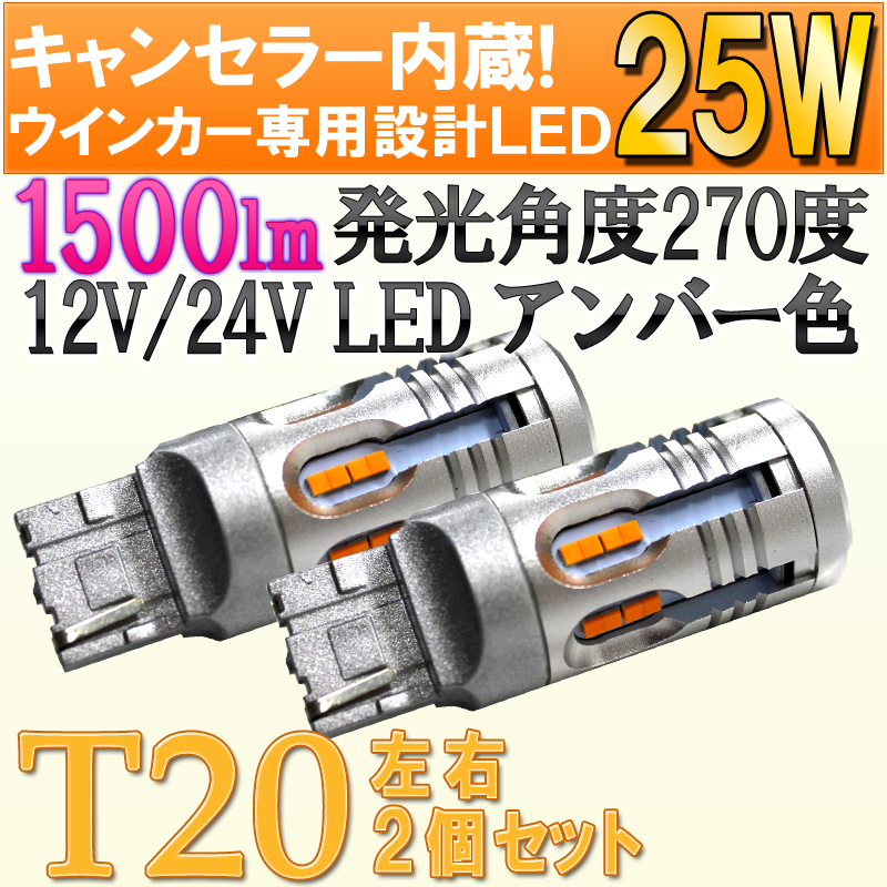 - 送料無料 ウインカー専用LED T20 25W 高輝度1500lm ハイフラ防止抵抗内蔵 左右セット アンバー T20シングル/T20ピンチ部違い