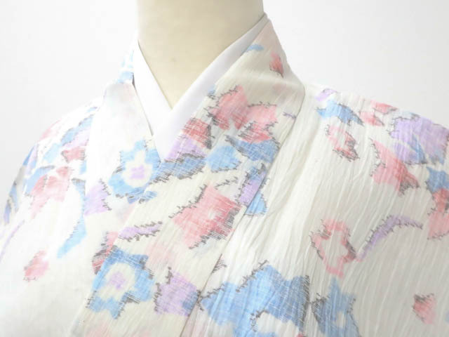 > 《古美術京松》リサイクル着物 昭和レトロ 小千代ちぢみ 夏物 夏 花 身丈約165.5cm 裄丈約65cm kyo7z09-1132