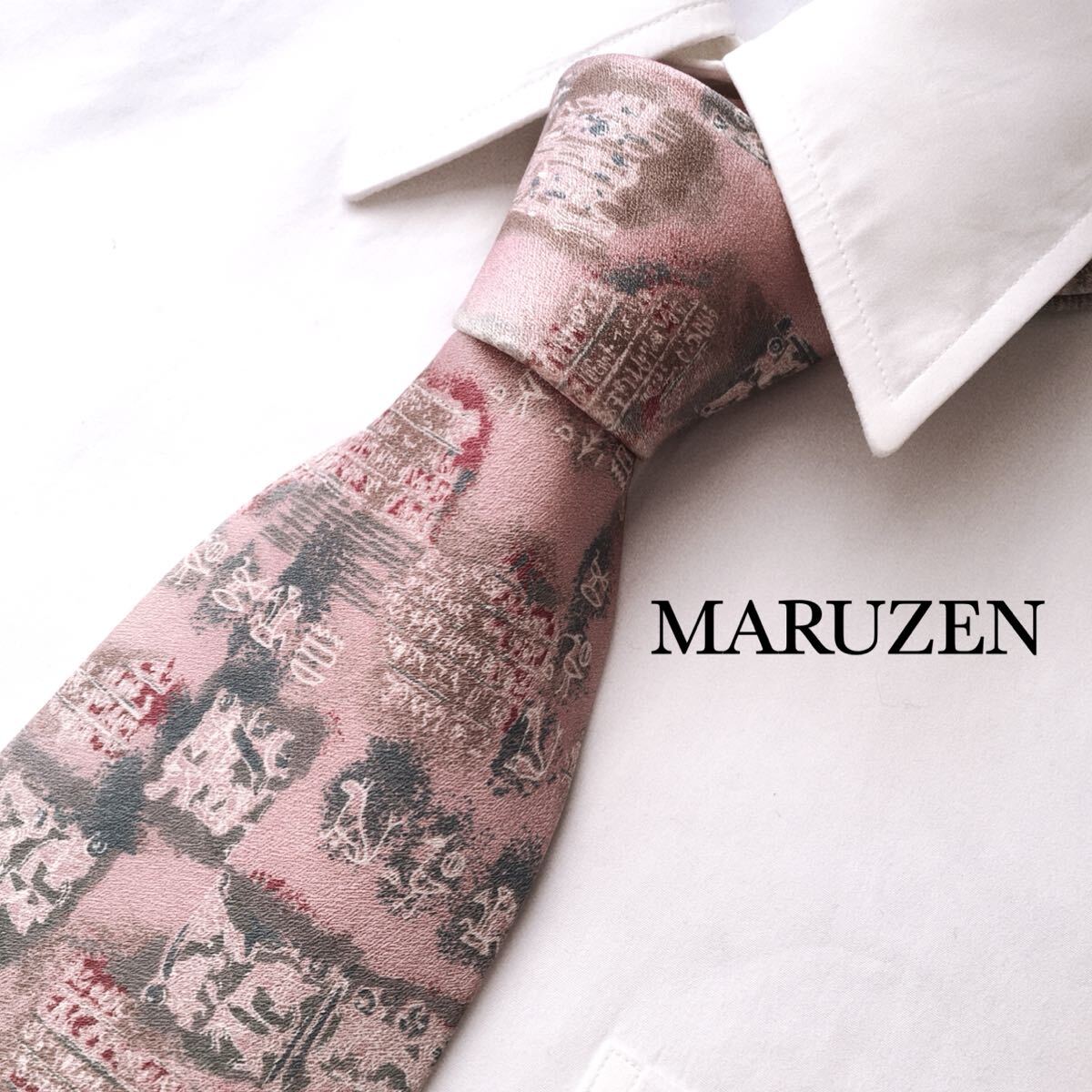 > MARUZEN マルゼン 丸善 ネクタイ シルク 絹 古代 エジプト ヒエログリフ 壁画 紳士服 日本製 総柄 ビジネス カジュアル ピンク