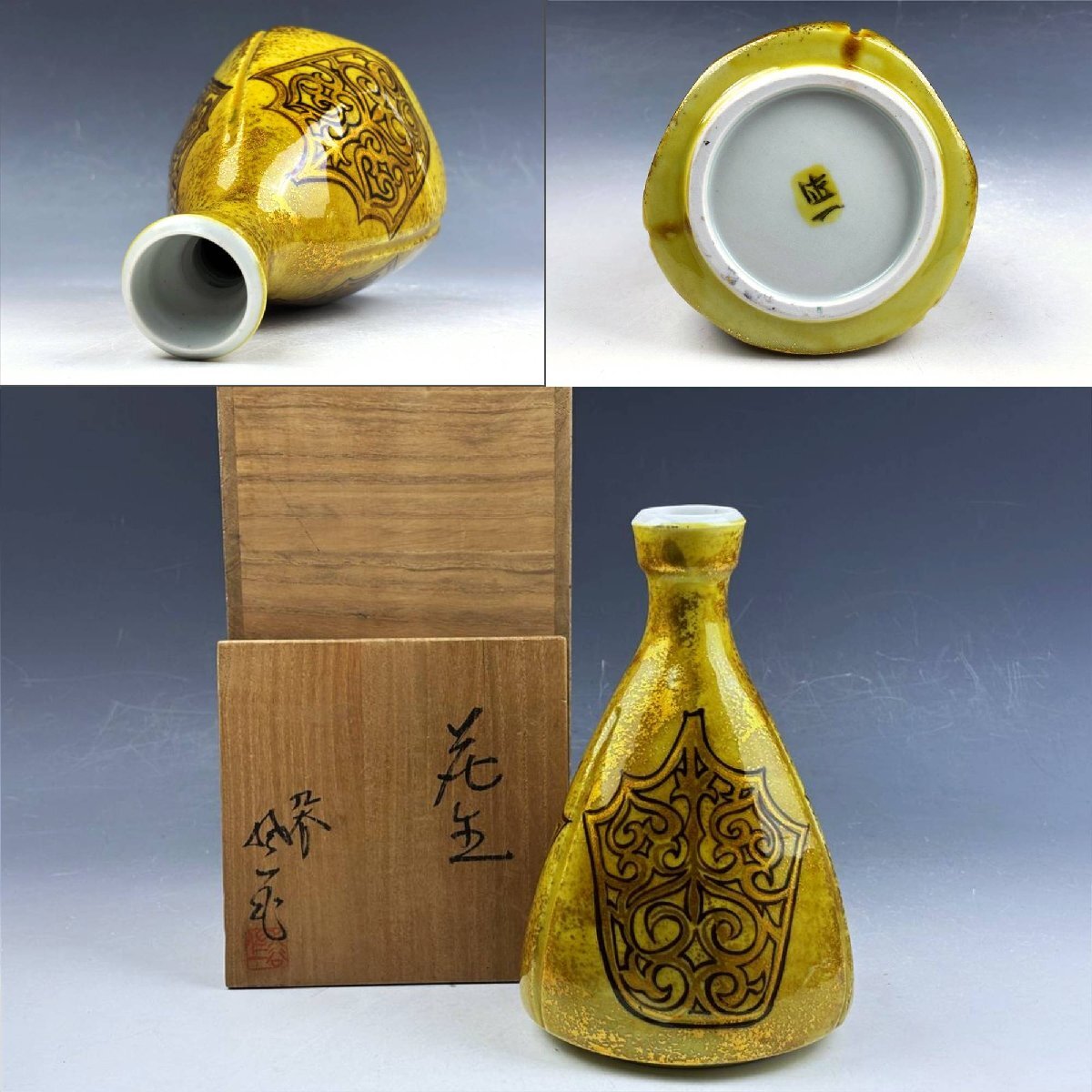 - 九谷焼 松本佐一 金彩 唐草文 三角面取 花生 花入 花瓶 飾瓶 無傷 共箱 華器 茶道具 時代物 古陶磁器 古美術骨董品 VNY111【遅日亭】