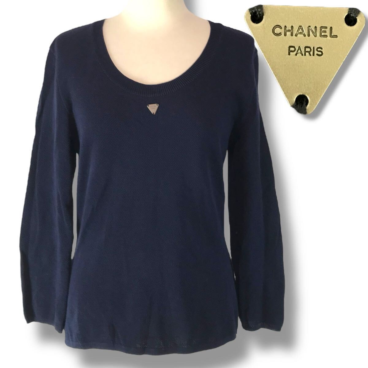 > c36 レア Vintage CHANEL 2000 シャネル ロゴプレート ニット ネイビー 長袖 トップス コットン100% 38 イタリア製 P44966 V00719 正規品
