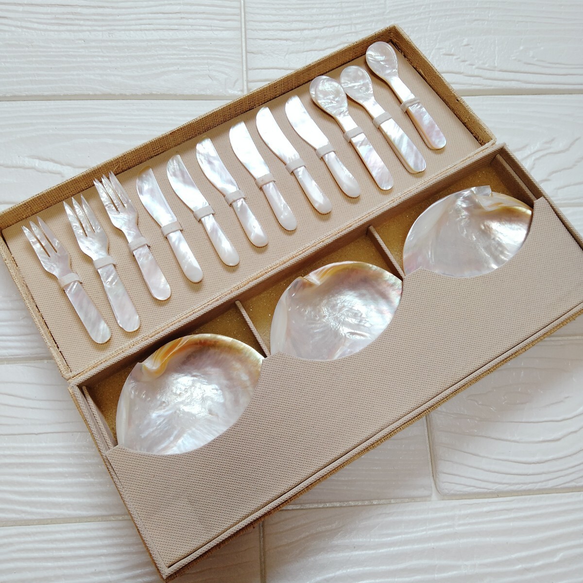 - 未使用*白蝶貝*カトラリー18本*小皿6枚*セット*シェル*スプーン*フォーク*ナイフ*貝皿*プレート*箱あり*食器*飾り皿*マザーオブパール