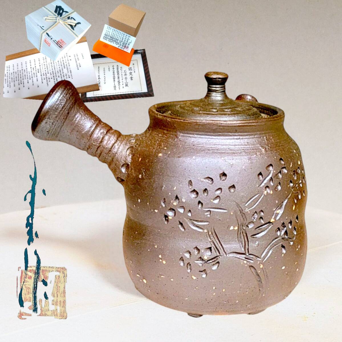 - (N10−9)彫文梨皮茶注 茶道具 焼締 常滑 無釉 茶壺 煎茶器 美品 新作物 ティーポット 一点物 作家物 備前 日本茶