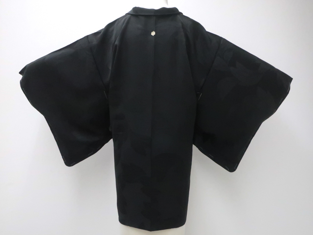 > 《京都一輝堂》リサイクル着物 羽織 黒羽織 一つ紋 地紋入り しつけ付き 紐なし 正絹 身丈82.5cm 裄丈62.5cm 25z09-5264