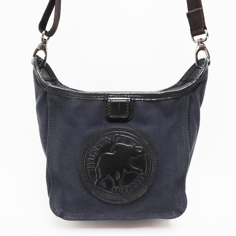 - M05-k084 HUNTING WORLD ハンティングワールド ロゴ キャンバス/レザー ショルダーバッグ ネイビー