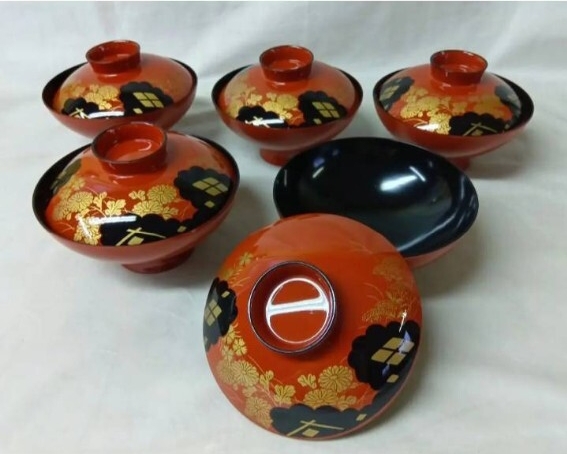 - 蓋付き椀 5客セット 漆器 汁椀 吸物椀 レトロ 古代吸椀 平安菊 菱紋様 お椀 和食器