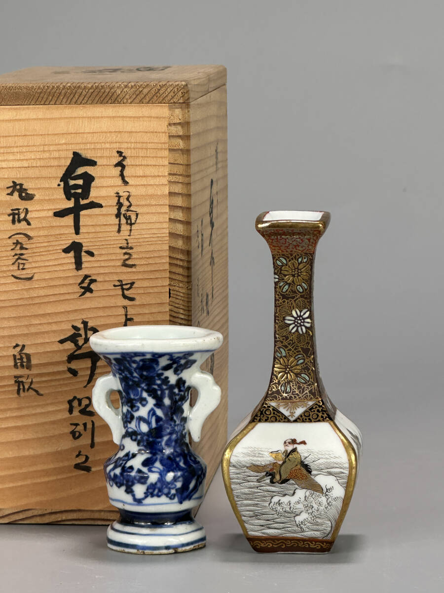 > 4UO02 華道具 小品 清朝青花花卉文瓶 九谷金絵人物花瓶 2点セット 時代物 古物 唐物