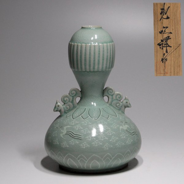 > 【TAKIYA】8039 池順鐸 『高麗青磁瓢型花入』 窯変 共箱 茶道具 高麗茶碗 浅川伯教 柳海剛 韓国人間文化財(人間国宝)