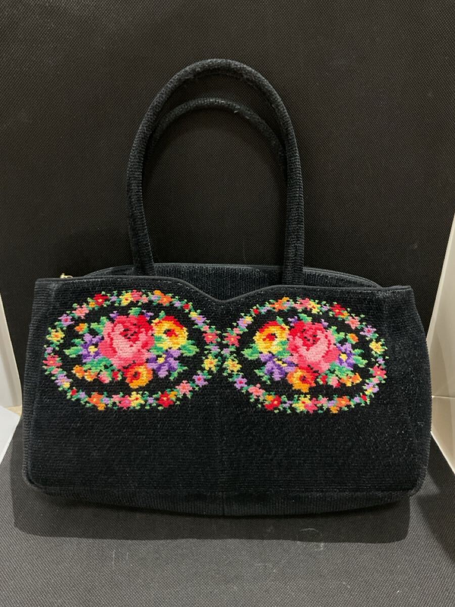 - 【P-3061】 FEILER ハンドバッグ 花柄 両側ポケット 赤 オレンジ 黄色 紫 黒 花輪デザイン