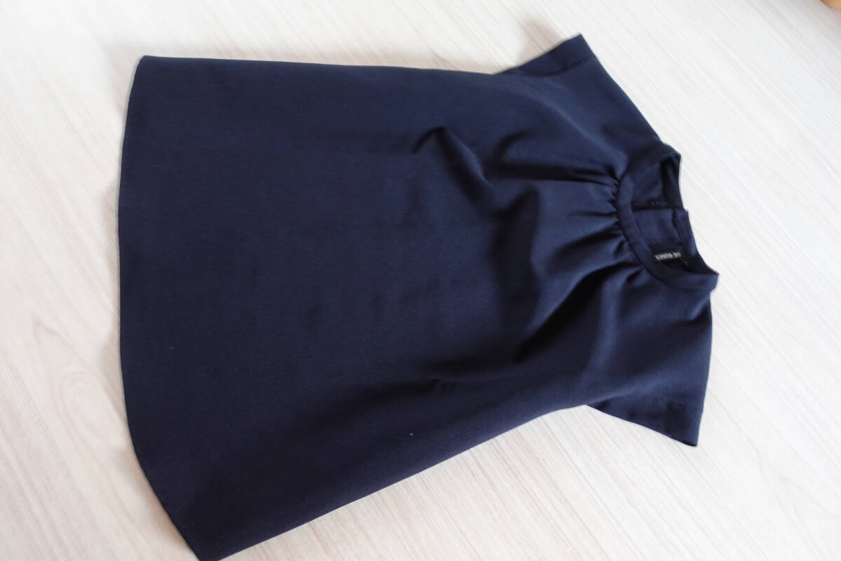 - 送料無料★美品L【HK WORKS LONDON】きれいめ上質フレンチスリーブブラウ風スカットソー★ネイビー紺無地シンプル通勤通学デート旅行