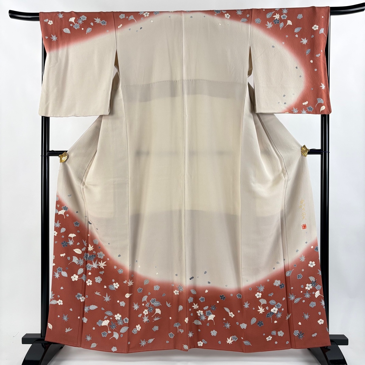 - 訪問着 身丈161.5cm 裄丈66.5cm M 袷 中村乃武夫 落款 吹き寄せ 金糸 金彩 ベージュ 正絹 名品 【中古】