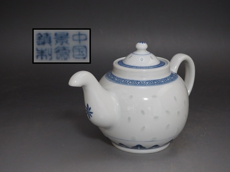 - A4504 中国 景徳鎮製 青華蛍手 急須 ☆ 中国茶器 煎茶道具 煎茶器 茶壺 茶壷 茶注 茶次 煎茶碗 染付 青花 磁器 朝鮮 唐物 美品 良品 無傷