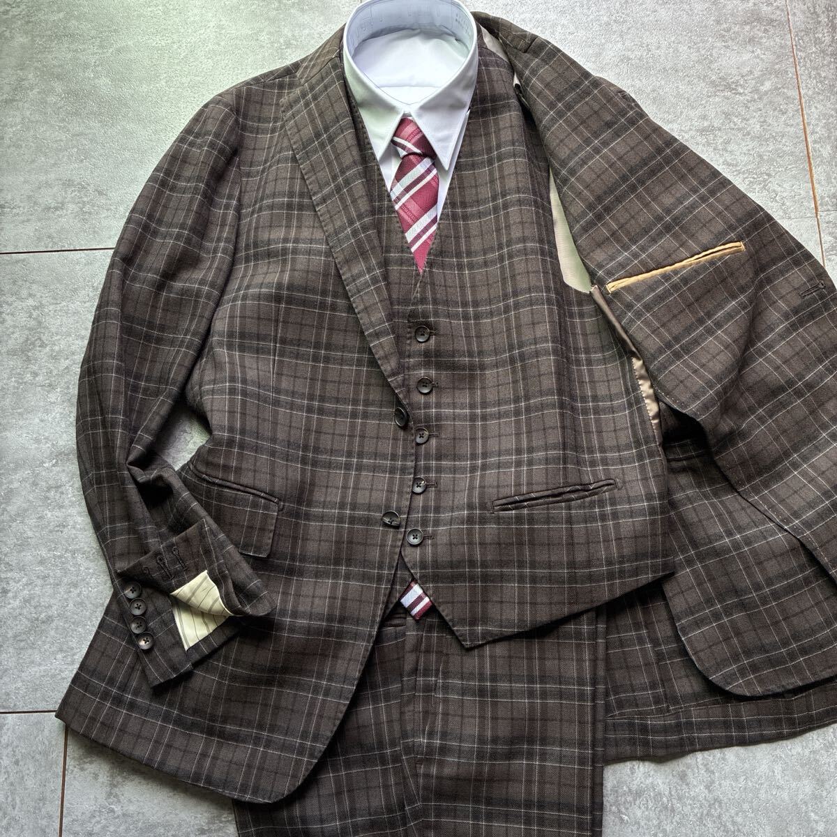 > 【訳あり美品・XL相当】Perfect Suit FActory P.S.FA 3ピース セットアップスーツ チェック 本切羽 ジャケット メンズ 秋冬 スリーピース
