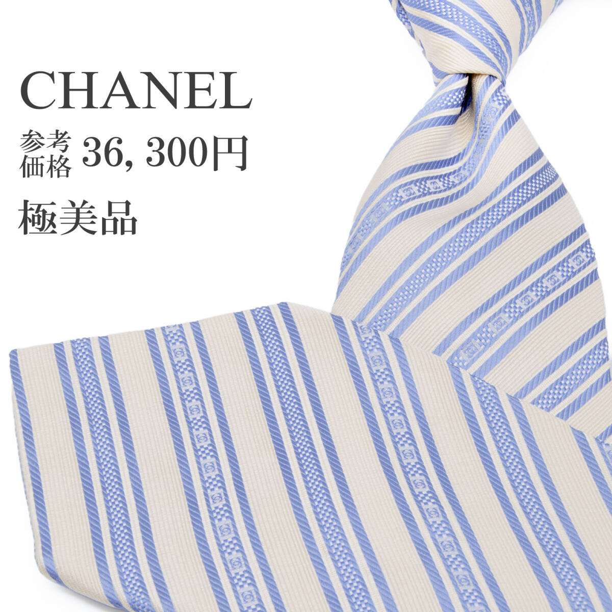 > 送料無料 シャネル ネクタイ ジャガード シルク 水色 白 オフホワイト ストライプ CCロゴ ココマーク 光沢 ブランド イタリア製 綺麗 P604