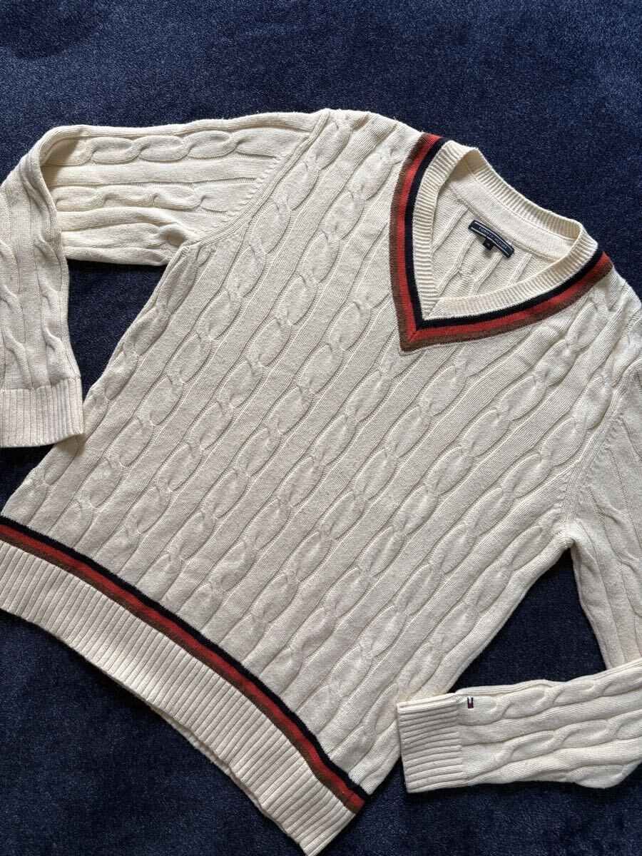 > 超美品 TOMMY HILFIGER トミーヒルフィガー 高品質素材 チルデンニット ケーブル編み Vネックセーターオールドスクール sizXL 正規販売
