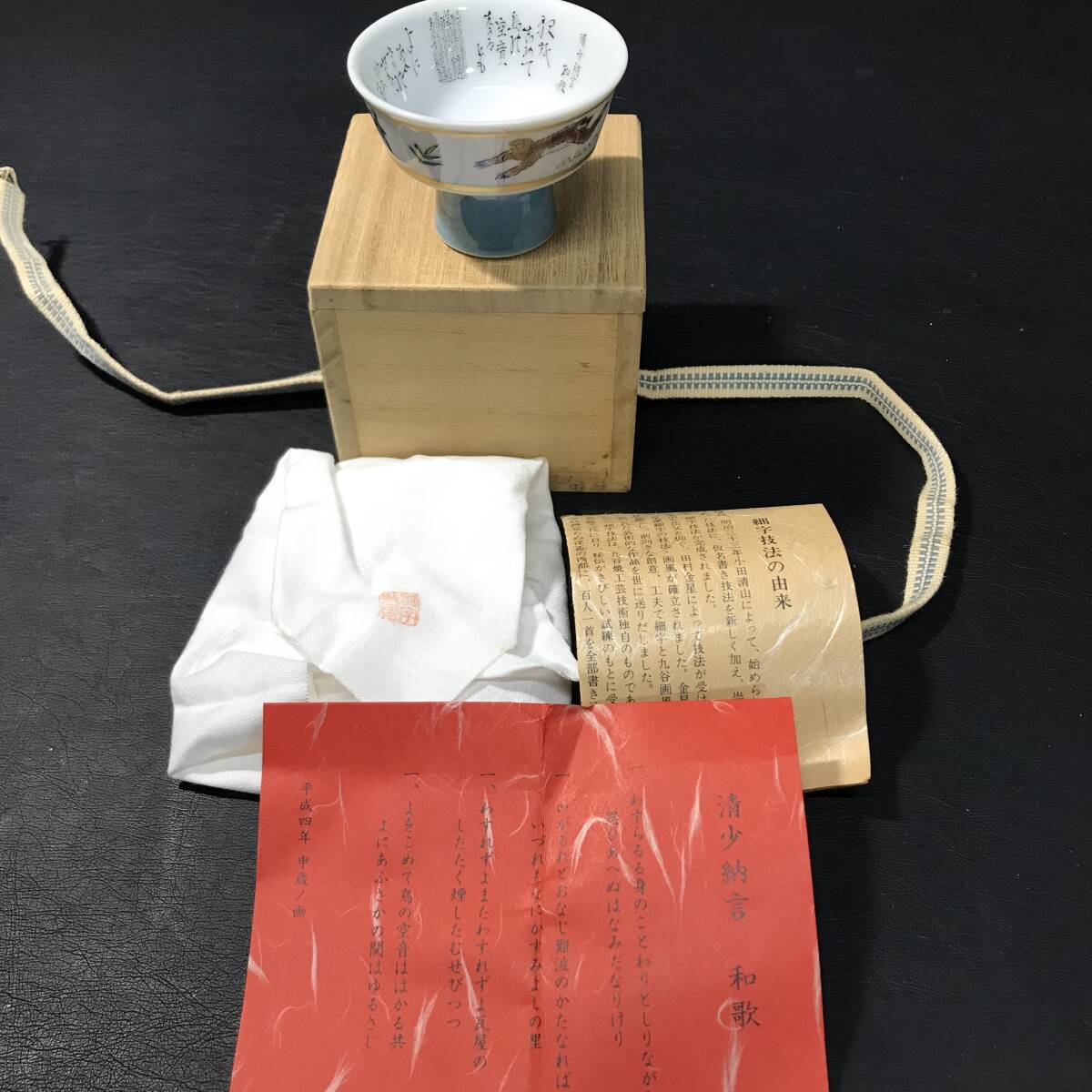 - ZA186 九谷焼 ぐい呑み 三代目 田村敬星作 細筆細字 清少納言 和歌 申年画