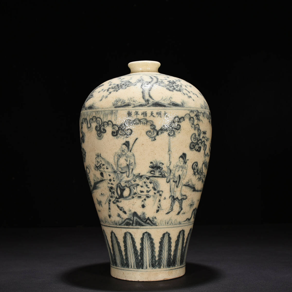 - 明時代 天順 青花 染付人物文梅瓶 唐物 箱付き 陶磁器 中国美術 古美術 置物 骨董品 H70