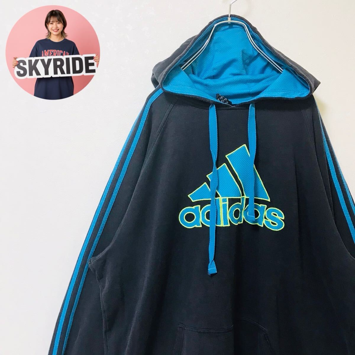 > 【人気】adidas アディダス パーカー 刺繍ロゴ 3本ライン XL ブラック コットン混 ビッグシルエット ゆるだぼ ストリート 古着 #TT0373