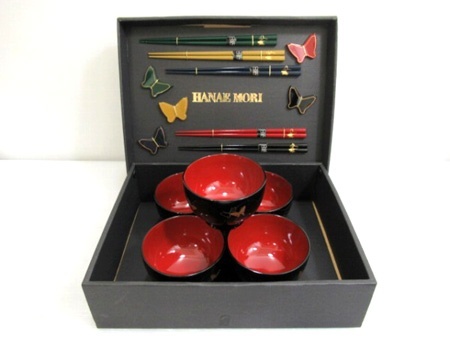 > ハナエモリ シッキシック CHIKI CHIC 汁椀×5 箸×5 箸置×5 スーパーセットごしき GO-100 森英恵 美品中古■