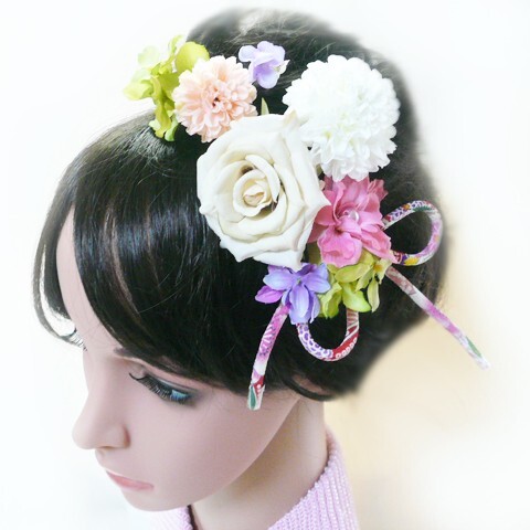 - 髪飾り 花 バラと菊小花 白ピンク 和装 結婚式 成人式 卒業式 振袖 簪(1)(2)