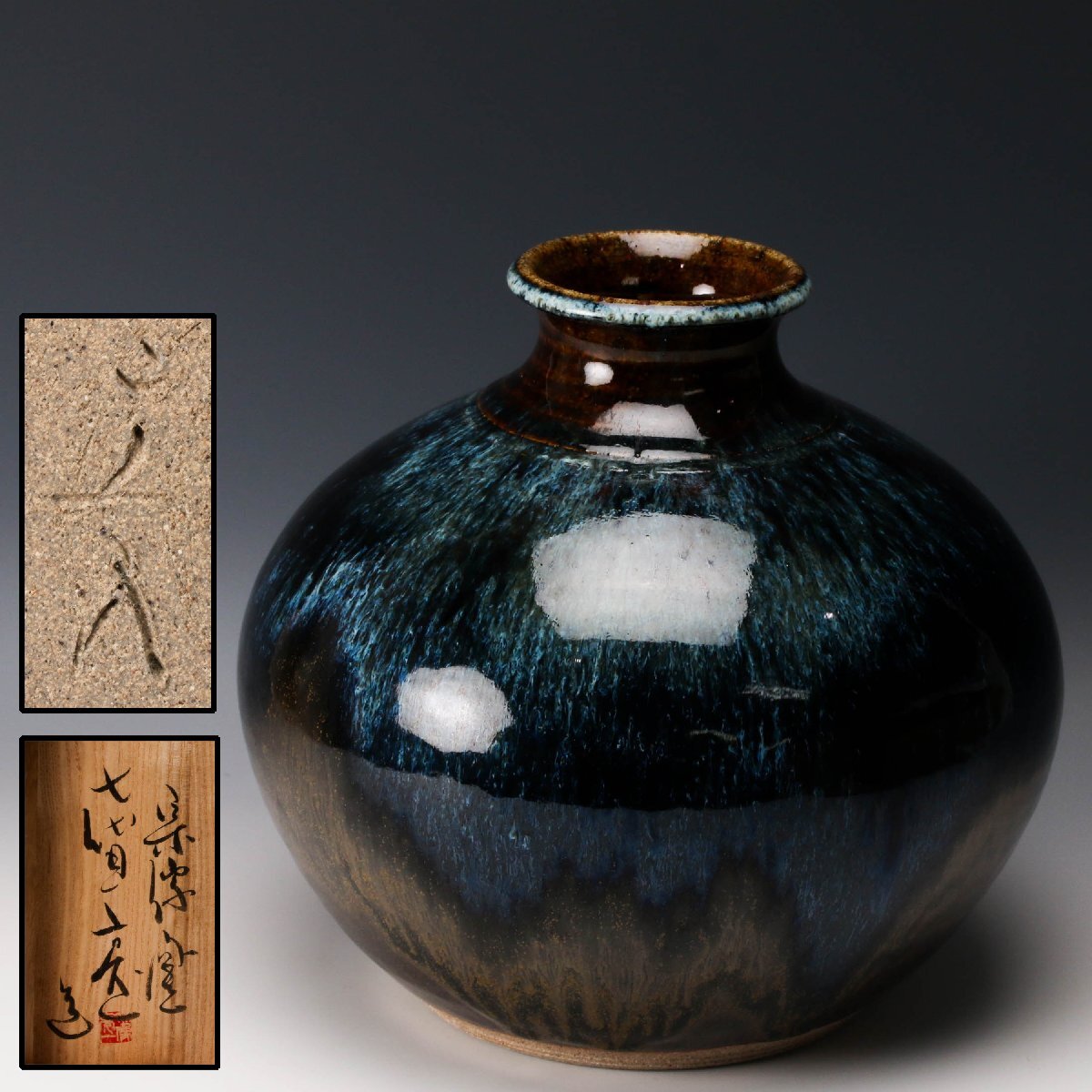 【佳香】宗像亮一 会津窯 鉄釉白流壷 共箱 栞 本物保証