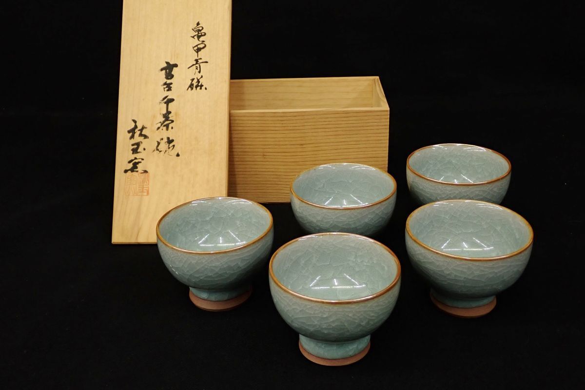 - ◆未使用 亀甲青磁 茶碗 秋玉窯 湯呑 5客◆煎茶道具/消費税0円