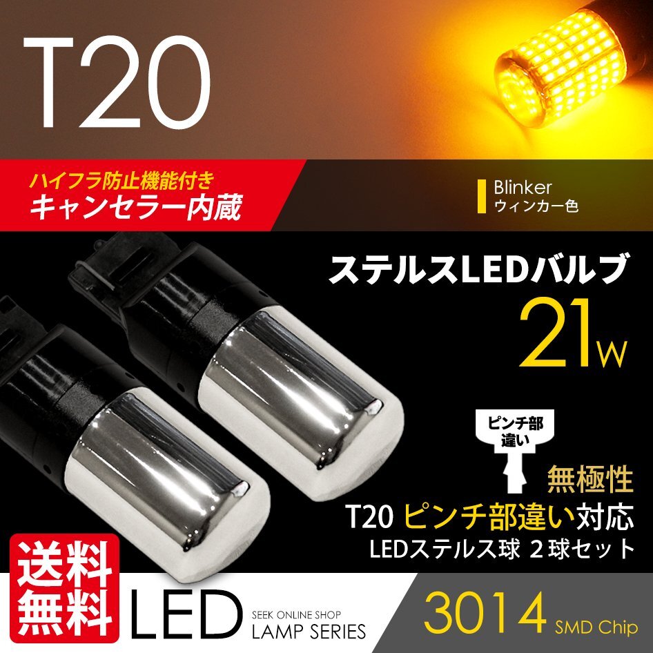 - T20 LED クロームバルブ ハイフラ防止 キャンセラー内蔵 ウインカー アンバー/黄 ピンチ部違い ウェッジ球 ステルス 21W ネコポス 送料無料
