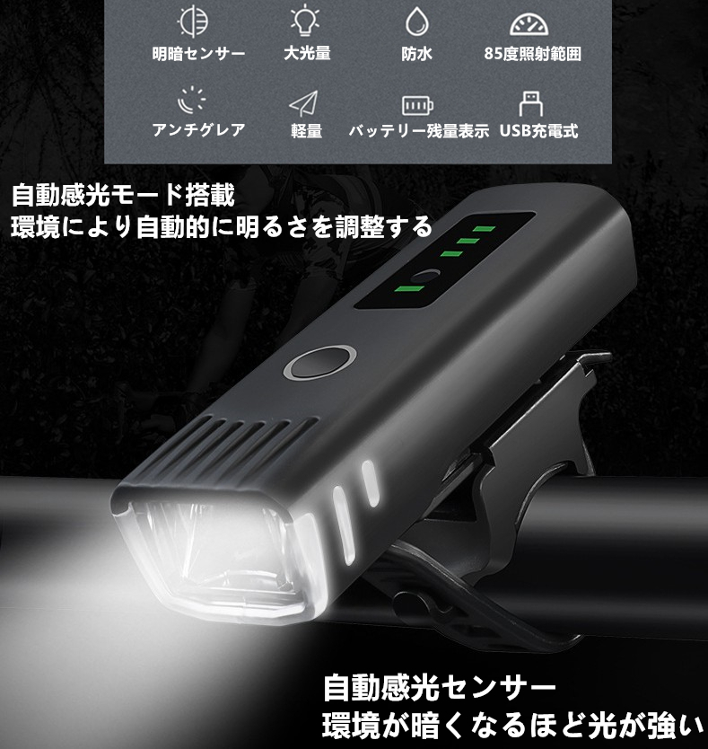 - 送料無料 LED 爆光 自転車 ライト 自動点灯 自動調整 LED 防水 USB充電式 自転車ライト