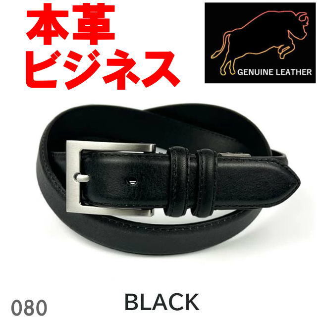 - ブラック ジェニュインレザー 本革 ダブルループビジネス ベルト 3cm 080