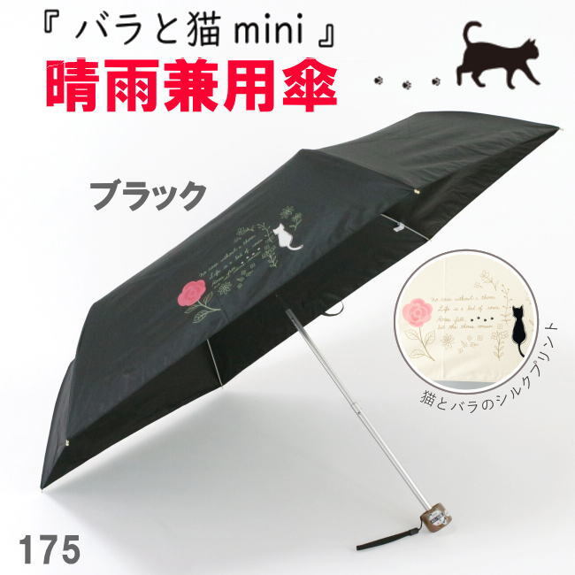> ブラック 遮光&遮熱 黒コーティング 175 晴雨兼用傘 50㎝楽ミニ『バラと猫 mini』