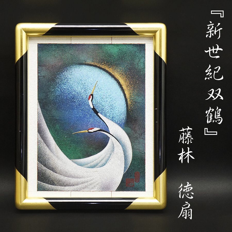 - 十二代 藤林徳扇『新世紀双鶴』伝統工芸作家 正絹 シルク 苑寿織匠 美術伝統工芸織 時代 骨董 額装 共シール 古美術品