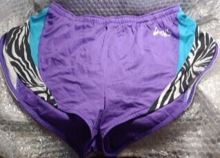> asics製、メンズランパン、江戸紫色に青・白黒縞模様、両サイドスリット全開、インナーパンツ無し、ポリエステル100%カ、L(胴囲80)サイズ,