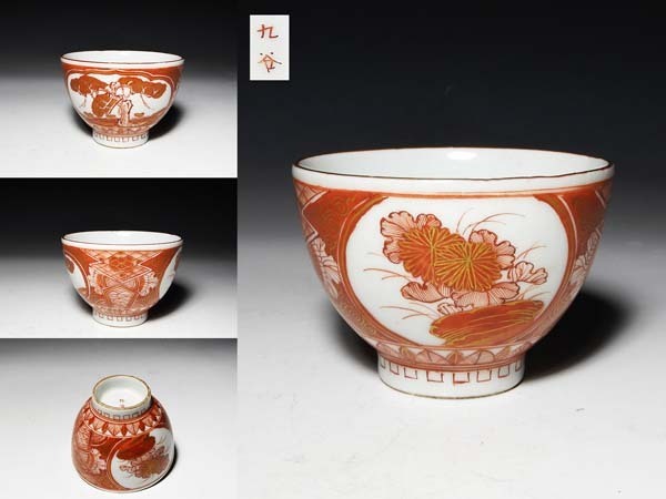 - 【桃】酒器ぐい呑み:九谷色絵窓絵松に菊花図猪口