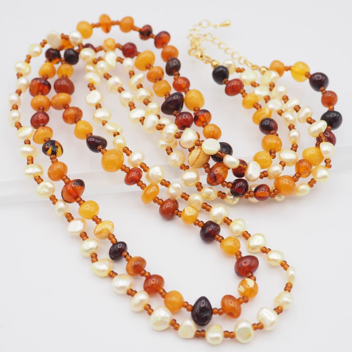 > G550 琥珀 コハク アンバー 淡水真珠 パール ネックレス 2連 マルチカラー ゴールド デザイン 6月誕生石