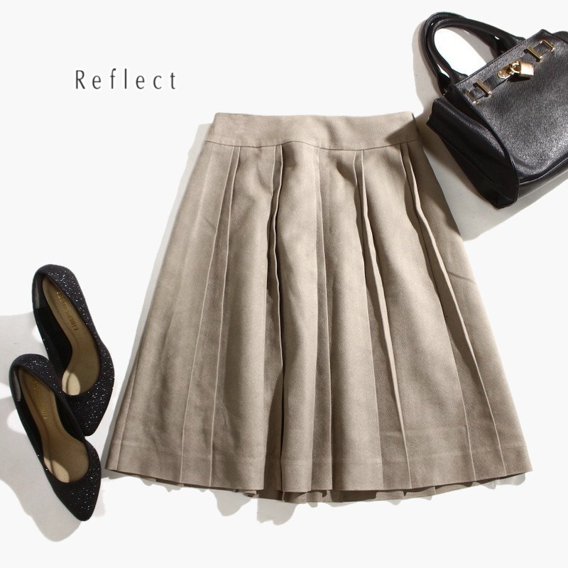 > 美品 リフレクト Reflect 株) ワールド 秋 冬 合皮レザー スエードライク プリーツスカート 9号 ベージュ グレー スカート レザースカート