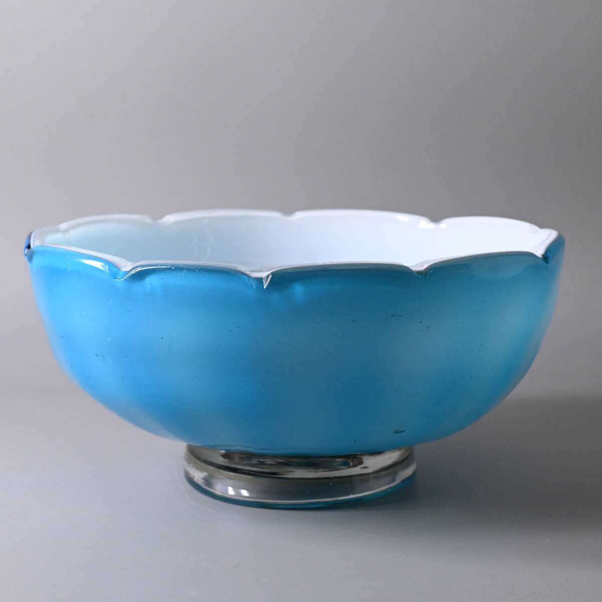- 1118 氷コップ 色ガラス 輪花鉢 径15cm 高7cm 水色 青 空色 乳白ガラス レトロ アンティーク 明治 大正