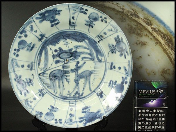 - 【銀閣】中国美術 呉須 青花 鹿紋 盤 φ21cm 明 旧家蔵出 送料無料(BB437)