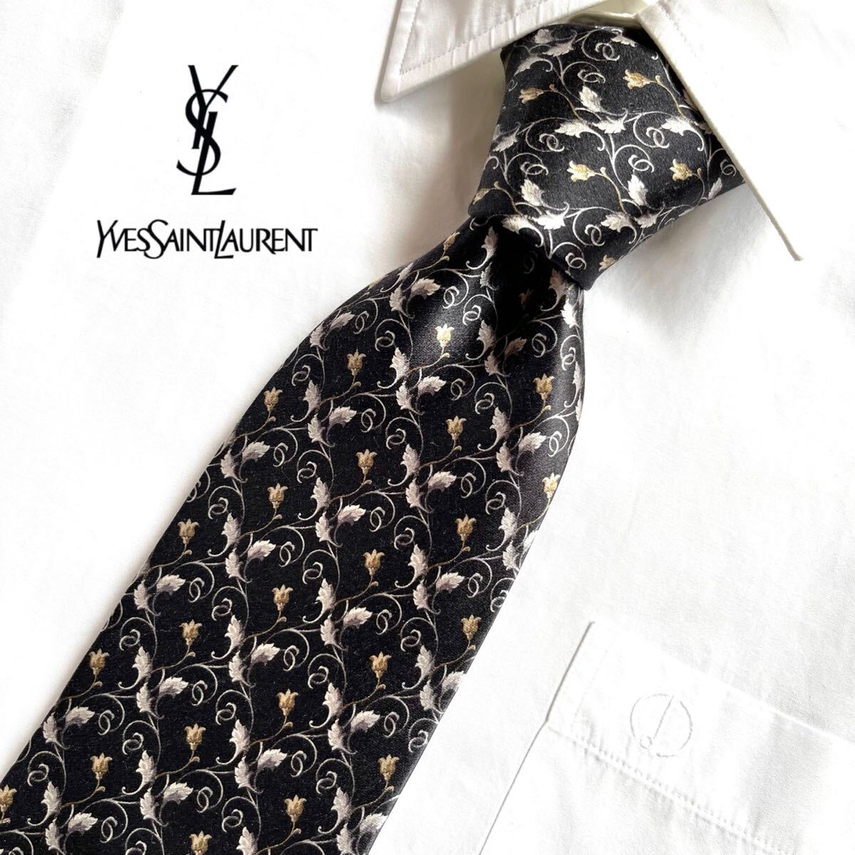 - YVESSAINTLAURENT イヴサンローラン シルク 絹 ネクタイ 日本製 花柄 ビジネス カジュアル フォーマル ブランドネクタイ ダークグレー