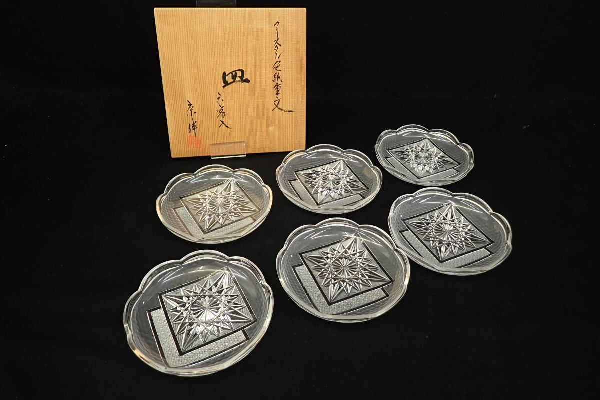 - ◆未使用 京伴 クリスタル色紙重文 皿 六枚◆高級クリスタル 切子ガラス/消費税0円
