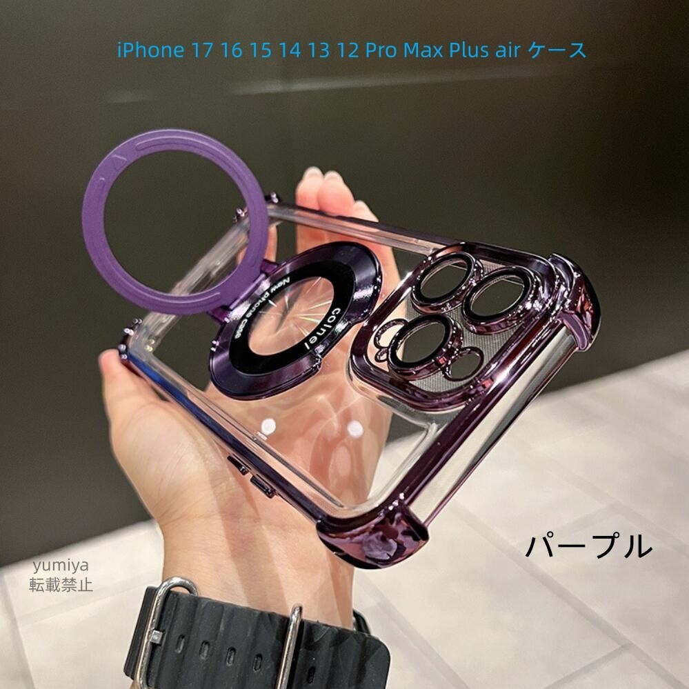 - iPhone 17 16 15 14 13 12 Pro Max Plus airケース レンズ保護 リング付き MagSafe充電 耐衝撃 クリアケース スタンド機能 スマホ パープル
